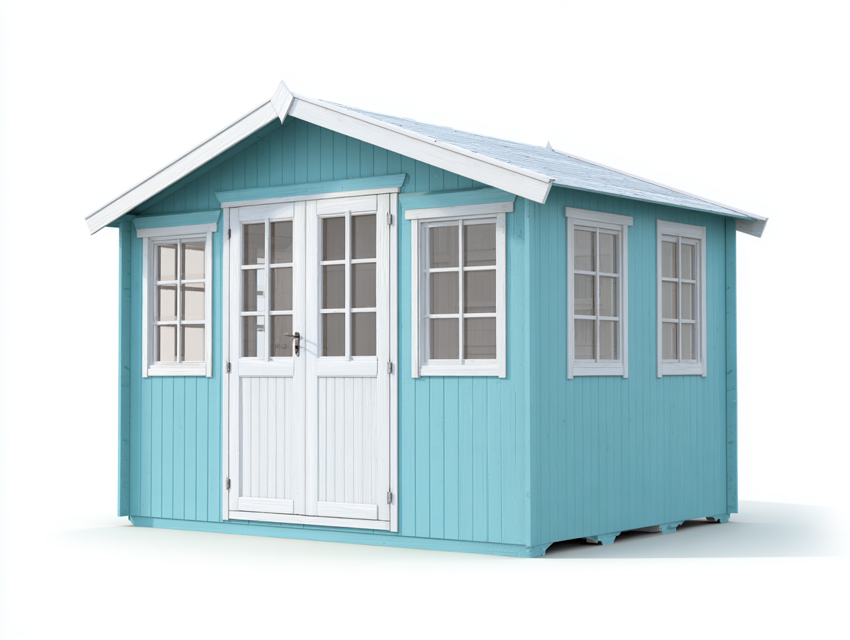 La struttura è realizzata in legno con pannelli verticali verniciati in colore azzurro, abbinati a finiture bianche su porte e finestre. Il legno è trattato per migliorare la resistenza all'uso esterno. Il tetto inclinato contribuisce al deflusso dell'acqua piovana e alla protezione della struttura.