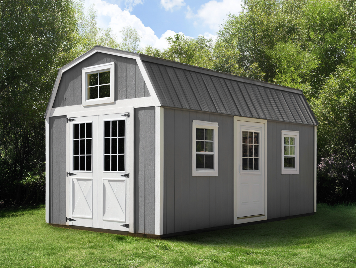 Le porte frontali facilitano l'accesso allo spazio interno. Le finestre laterali migliorano la ventilazione naturale e la luminosità interna. La struttura è adatta per l'organizzazione di attrezzi da giardino, mobili da esterno o oggetti utilizzati nello spazio outdoor.