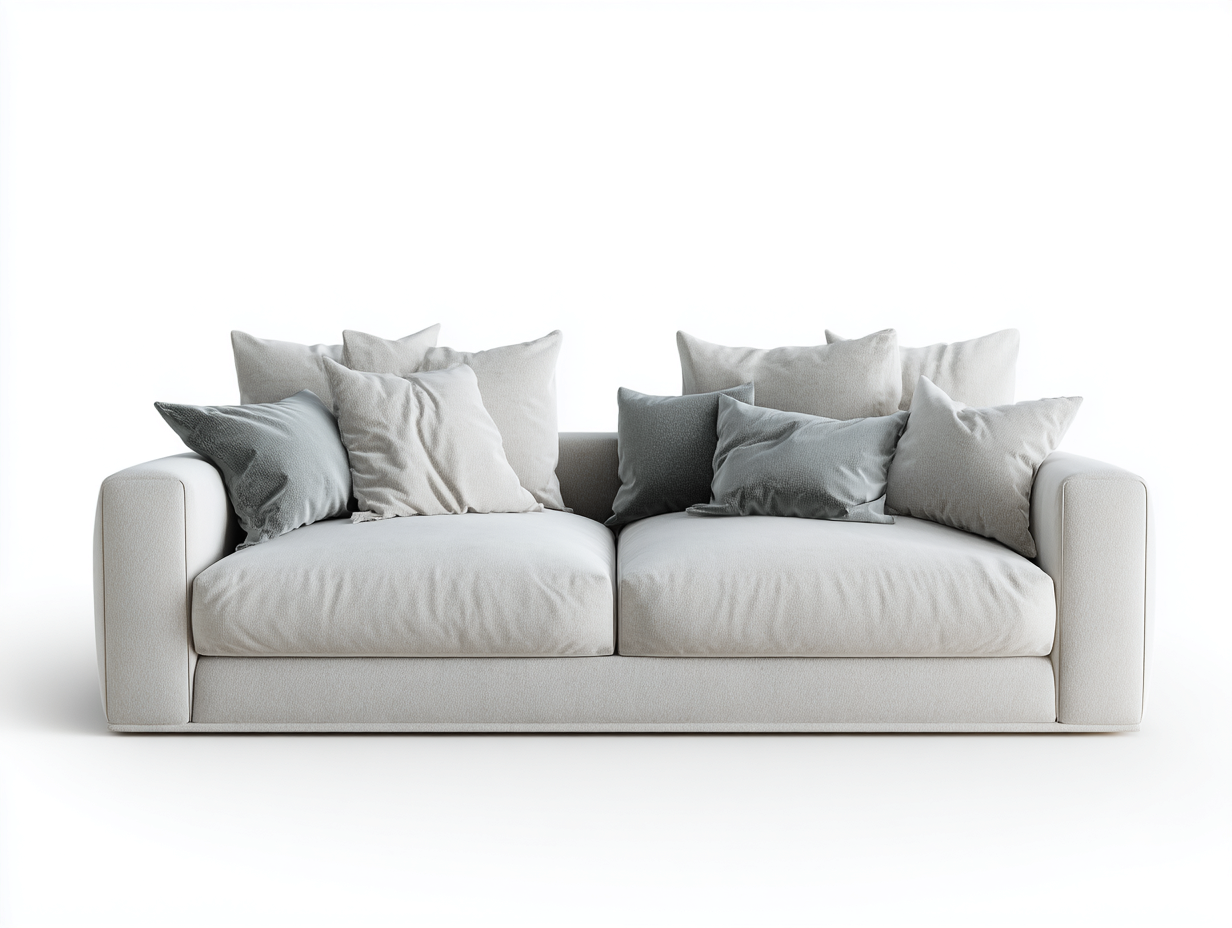 Il divano presenta braccioli ampi e una seduta profonda che favoriscono una postura rilassata. Il design moderno e la tonalità neutra facilitano l'abbinamento con diversi stili di arredamento. La struttura stabile e la superficie imbottita garantiscono comfort e supporto per l'utilizzo quotidiano in soggiorno o area relax.