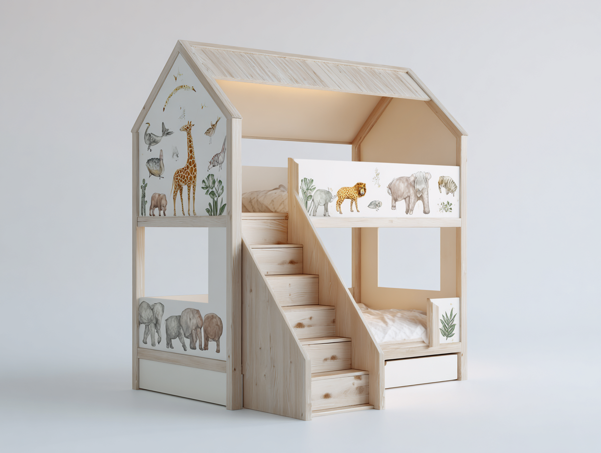 Questo letto a castello per bambini è progettato per arredare la cameretta con uno stile creativo e funzionale. La struttura a forma di casa crea uno spazio accogliente dedicato al riposo e al gioco. La combinazione di legno naturale e pannelli decorativi con illustrazioni aggiunge un elemento visivo piacevole all'ambiente.