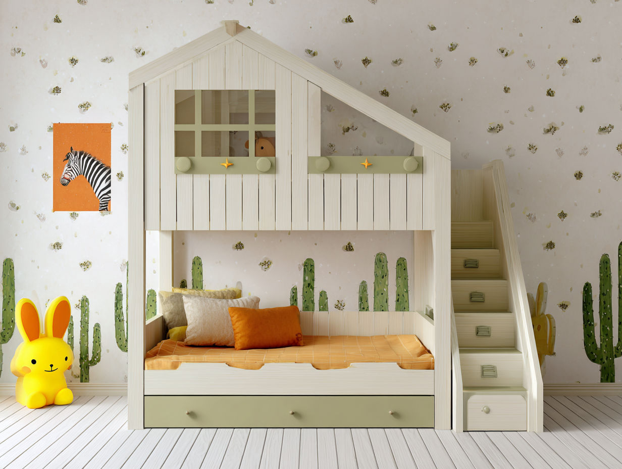 Questo letto a castello per bambini con struttura a forma di casa è progettato per creare uno spazio accogliente nella cameretta. Il design con tetto inclinato e finestra decorativa dona al letto un aspetto originale e caldo. La combinazione di legno naturale e pannelli color verde chiaro rende il mobile adatto ad ambienti arredati in stile moderno o nordico.