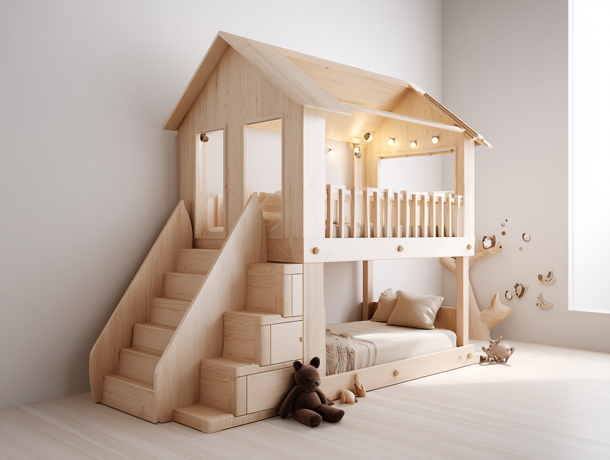 Questo letto a castello per bambini con struttura a forma di casa è progettato per creare uno spazio accogliente nella cameretta. Il design architettonico con tetto inclinato e balcone superiore dona un aspetto caldo e naturale all'ambiente. La struttura in legno naturale si integra facilmente con arredi moderni o scandinavi.